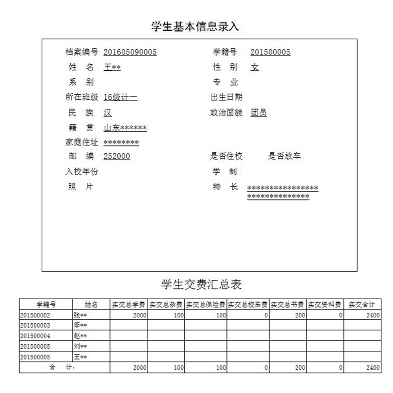 統(tǒng)計查詢則包括學(xué)生交費(fèi)匯總、班級每學(xué)期交費(fèi)統(tǒng)計、費(fèi)用匯總和欠費(fèi)學(xué)生名單