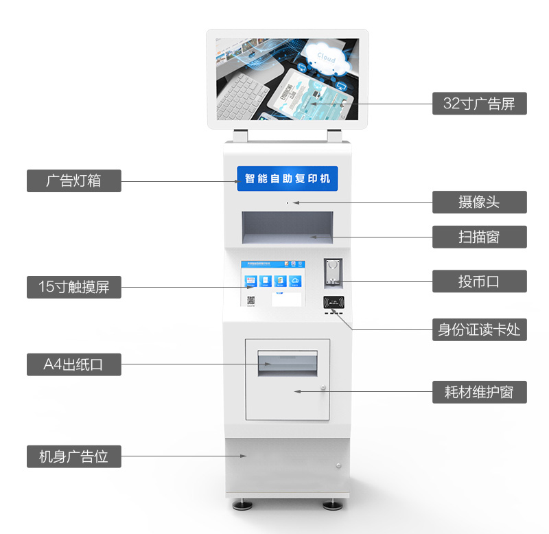 ? ? ? 自助復(fù)印打印終端可以進(jìn)行文件掃描、U盤打印、身份證復(fù)印、文件復(fù)印,擁有微信、支付寶、銀聯(lián)、現(xiàn)金多種支付方式,并且靈活的部署在商場(chǎng)、購物中心、銀行、辦事大廳等人流密集地,實(shí)現(xiàn)無人值守且操作簡(jiǎn)單,使人們?cè)谛枰蛴r(shí)能夠及時(shí)提供打印服務(wù)。