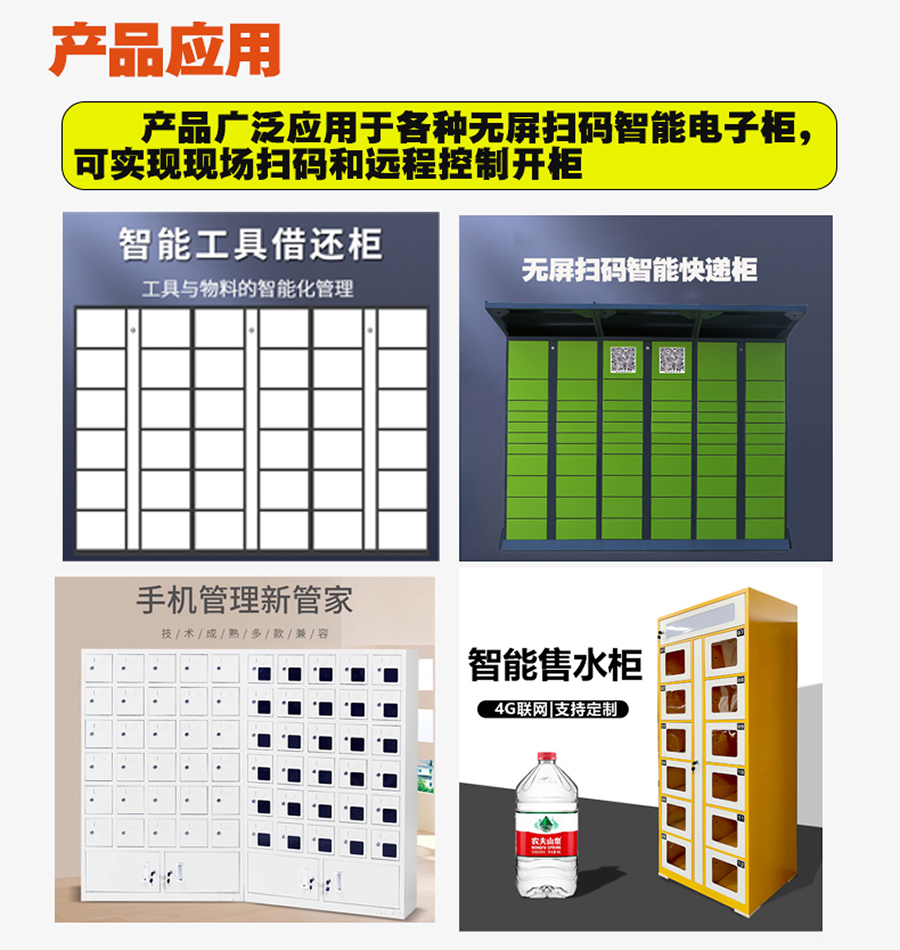 無屏掃碼智能柜鎖控板廣泛應(yīng)用于快遞柜、儲(chǔ)物柜、信報(bào)箱、格子售販機(jī)、寄存柜、共享陪護(hù)床、洗衣柜等等。